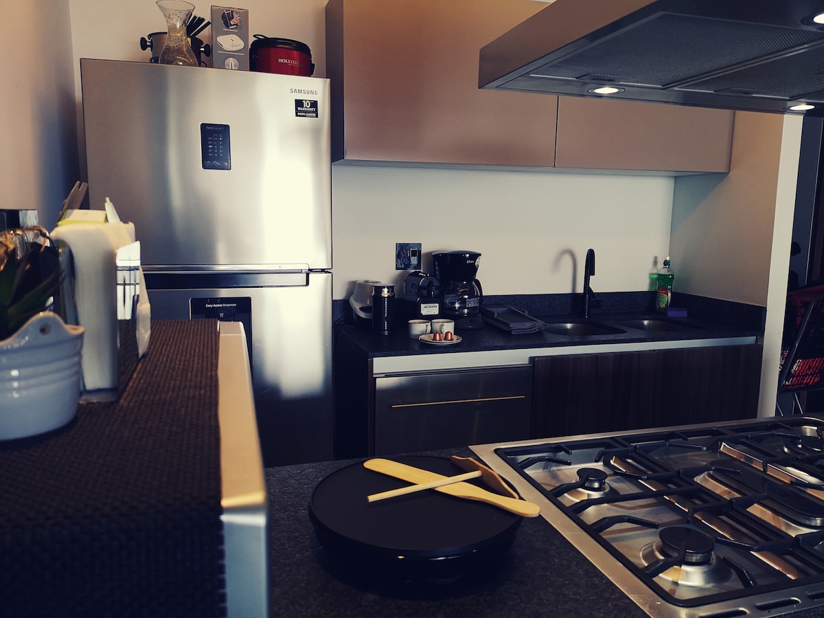 Apartamento espacioso y acogedor, ideal para trabajar con excelente internet 100 Megas. Dos amplios dormitorios, ambos con aire acondicionado, baños completos, vestidor y ventilador de techo. Sala de TV donde puede dormir una quinta persona. Sala+comedor con ventana grande y 4 ventiladores portátiles para moverse por cualquier área. Cocina completamente equipada con vajilla para 6 personas. A los huéspedes anteriores les ha gustado la elegante decoración, comodidades y ubicación privilegiada.