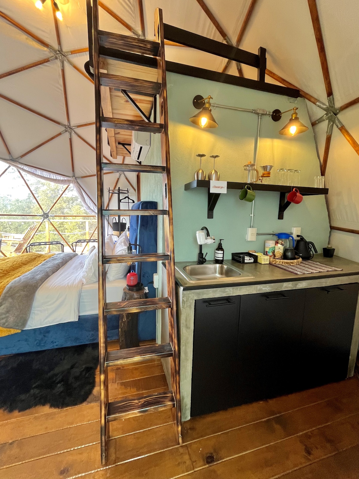 **Bienvenidos a nuestro Domo Individual** Ubicado en lo alto de una pintoresca montaña, dentro del viñedo de Puerta del Lobo, te damos la bienvenida a nuestro Domo individual, ideal para parejas en busca de una experiencia única y lujosa. Te ofrecemos un diseño elegante y moderno, con una cúpula transparente que te permite contemplar las estrellas desde la comodidad de tu cama tamaño king. La decoración está cuidadosamente seleccionada para crear un ambiente romántico y acogedor.