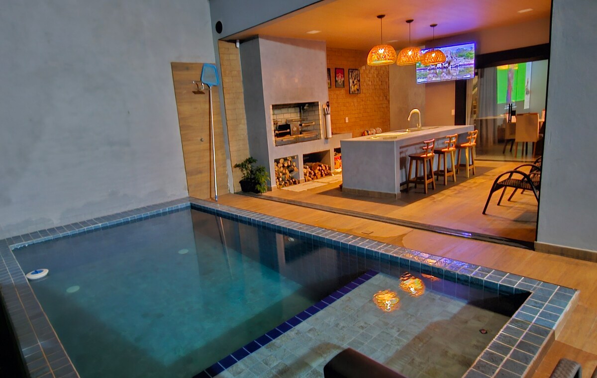 Aproveite esta casa moderna e completa na Enseada Azul, ideal para famílias. A sala conta com projetor e mesa para 8 pessoas. A cozinha tem uma ilha grande com 6 banquetas, fogão de indução, lava-louças, forno e armários equipados. Na área gourmet há parrilha argentina e uruguaia, fogão a lenha, TV e outra ilha com banquetas. Além disso, a casa oferece piscina, espaço para refeições externas, campinho de futebol, área gramada e deck no lago para pesca e contemplação.