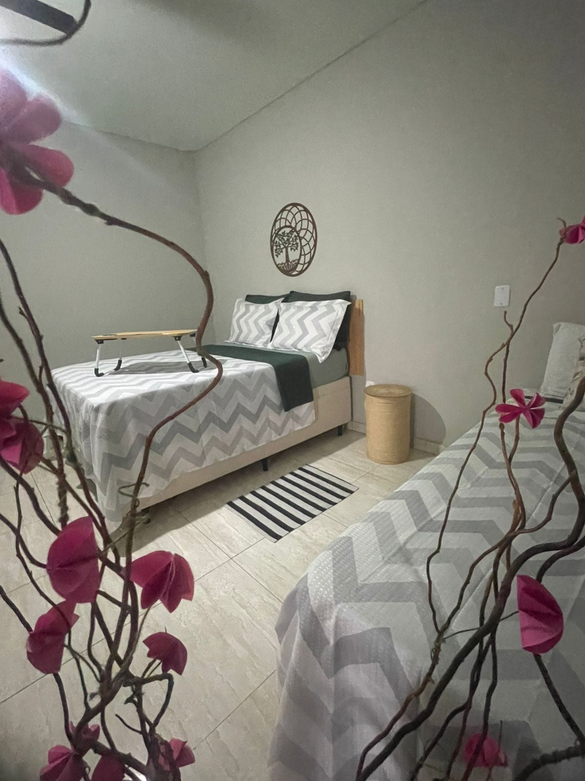 Casa en una región tranquila, nueva y cómoda. Bien ubicado en mercados, farmacias, bancos, restaurantes y panaderías. Estamos a 6 minutos. de la estación de Taboão y a 11 minutos del aeropuerto. La casa tiene 1 habitación con aire acondicionado y 3 camas , con 2 vigas y 1 cama doble. Capacidad para hasta 6 personas. Colchones cómodos para garantizar un sueño nocturno. Conviértete en una estancia corta o larga. Nuestro espacio también tiene estacionamiento en el lugar, incluido en el valor. Ven y quédate con nosotros, ¡será un placer!