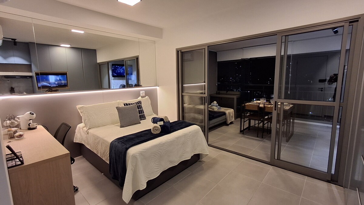Estudio de diseño único y de lujo en un condominio exquisito Una experiencia elegante en este lugar muy bien ubicado cuenta con: - Región central de Guarulhos; - Aeropuerto de Guarulhos a 7 km; - A 3 minutos de la autopista Dutra; - A 5 minutos del Hospital São Luís. - A 5 minutos de Internacional Shopping. - A 10 minutos de Shopping Maia; - A 10 km de São Paulo. Disfruta de un refugio moderno, totalmente equipado y decorado con estilo. Este increíble lugar ofrece una experiencia como anfitrión de alta calidad.