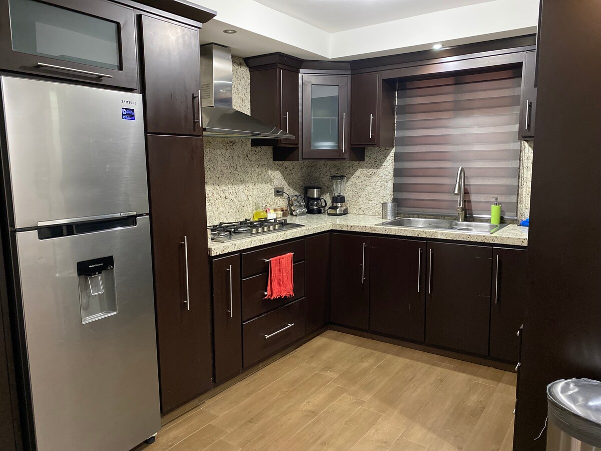 Éste elegante Depa esta dentro de una casa amplia y moderna, es ideal para viajes en familia, eventos y negocios, se ubica en el segundo piso, incluye: - Cama King (2 personas) - Sofácama 1 - Baño exclusivo - Cocineta - Cafetera, micro (suministros) - Smart TV - Escritorio - Maletero - Comedor PLANTA BAJA: - Lobby (área común) - Patio y jardín - Salón de eventos (bajo reserva) - Estacionamiento (solicitar disponibilidad) PLANTA ALTA: - Vestíbulo - Cocina - Cuarto de lavado y planchado