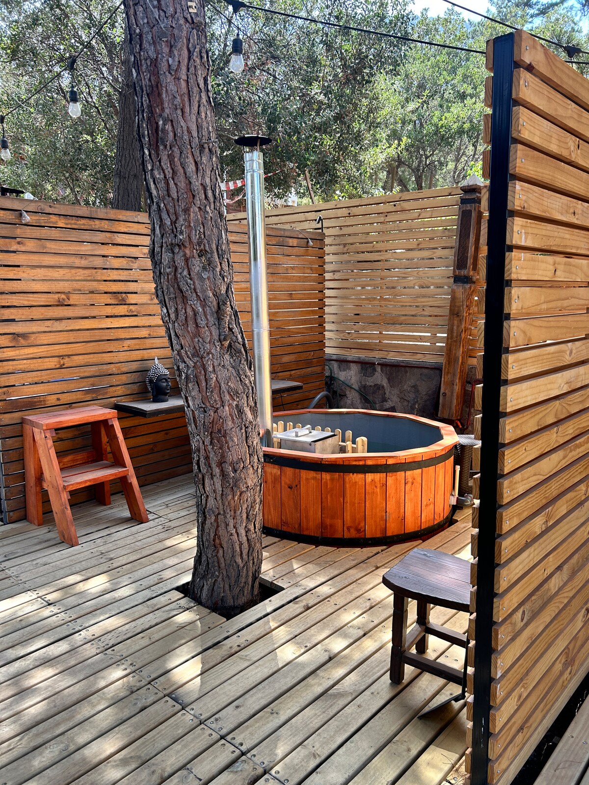 Acogedora cabaña de 2 pisos, que te permite tener una vista excepcional a las montañas. La cual se encuentra inmersa en un bosque nativo en el que debemos caminar por 150 mts desde el estacionamiento, durante el camino podemos apreciar diversa flora que solo veras en el cajón del Maipo. Es un lugar ideal para relajarse y descansar ya que incluye terraza (con mesa y sillas) , tinajas calientes a leña con hidromasajes y horno de barro.