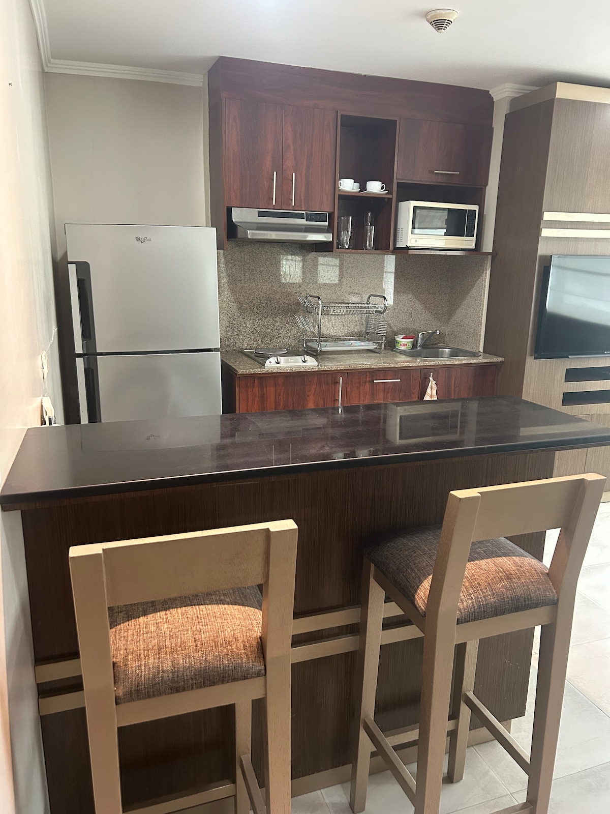 ☞ Vista a la ciudad ☞ Ubicación al lado del City Mall ☞ Estacionamiento gratis ☞ Aire acondicionado centralizado ☞ Cama queen ☞ Sofá cama en el living ☞ Piscina ☞ Gimnasio ☞ Mesa de ping pong ☞ TV de 55” en el living ☞ TV de 55” en la habitación ☞ Microondas