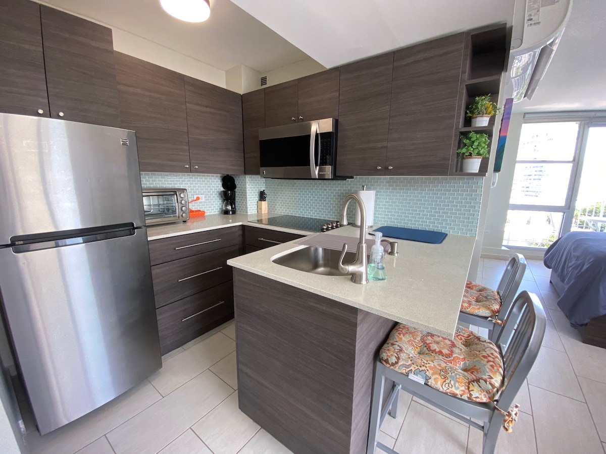 Te encantará alojarte en este elegante apartamento que fue cuidadosamente rediseñado con mucha pasión y amor❤️. Ten la seguridad de que nos tomamos muy en serio los procedimientos de limpieza y desinfección y que nuestro gerente de limpieza está obsesionado con ellos. Con hermosas vistas al cielo azul y al mar durante el día y una magnífica vista de la ciudad durante la noche, a solo 10 minutos del aeropuerto SJU, será tu lugar perfecto para disfrutar de la isla al máximo. Camina y disfruta de la playa, casinos, restaurantes y tiendas alrededor de Condado.