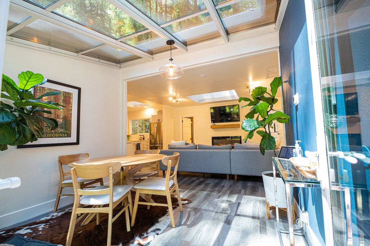 Ubicada entre majestuosas secuoyas, nuestra encantadora y elegante casa ofrece un refugio único para los huéspedes que buscan una escapada tranquila en plena naturaleza. Entra para descubrir un espacio habitable cuidadosamente diseñado, adornado con detalles de madera natural, una decoración elegante y una amplia luz natural que fluye a través de las ventanas. Ya sea que estés buscando una escapada romántica, unas vacaciones familiares o un refugio de fin de semana, nuestro hogar ofrece la combinación perfecta de comodidad, conveniencia y belleza natural. A 4 minutos del centro de la ciudad.