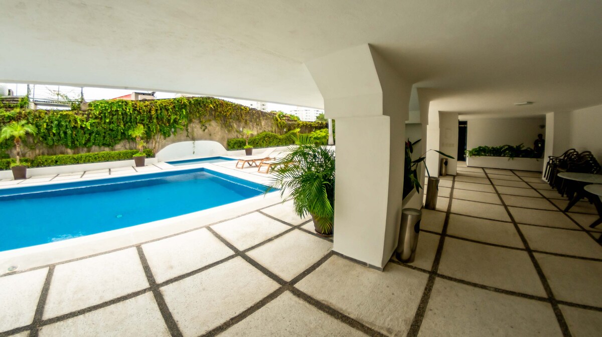 Departamento tipo estudio bien equipado; muy cómodo con 2 camas matrimoniales y 1 sofá cama. Cuenta con Aire Acondicionado, wifi, Internet, tv por cable, Lavadora, Plancha, Cocina Equipada con microondas, Licuadora y Cafetera El edificio tiene Alberca, Jacuzzi, Área de juegos, Elevadores, Vigilancia 24 horas, Estacionamiento gratuito. Rodeado de Centros Comerciales, Restaurantes, Bares. Zona segura y Tranquila, Atraviesa la calle y disfruta la mejor playa de Acapulco y una vista espectacular.