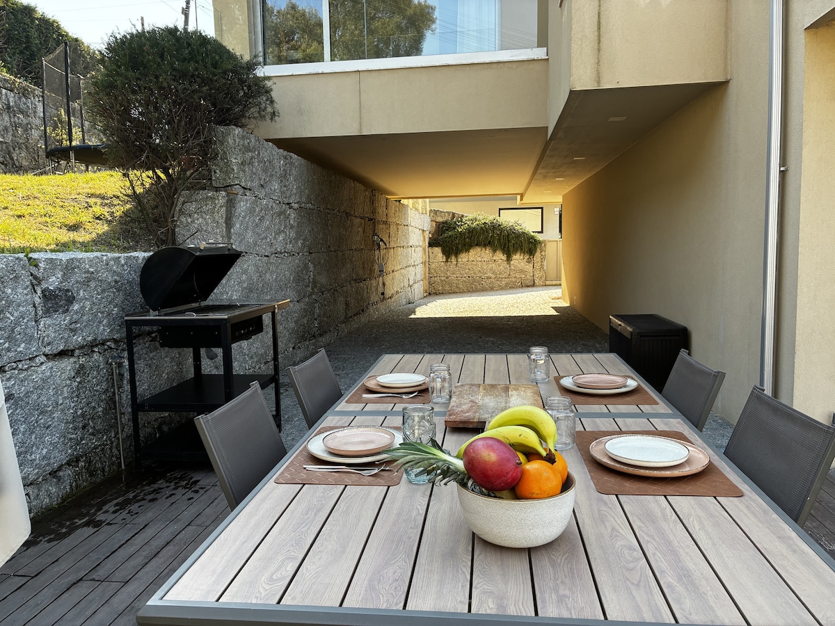 Villa entera situada en la ciudad de Braga. Consta de: 1 suite más 3 dormitorios dobles, 3 baños, amplio comedor y sala de estar con chimenea y aire acondicionado, gran cocina equipada, lavandería, garaje y excelente césped con ducha. Tiene vistas al parque de juegos de Braga, Bom Jesus, ciudad y montaña de Sameiro. La casa se encuentra a 30 km de la playa y de las montañas de Cabreira y del Parque Natural de Peneda Gerês.