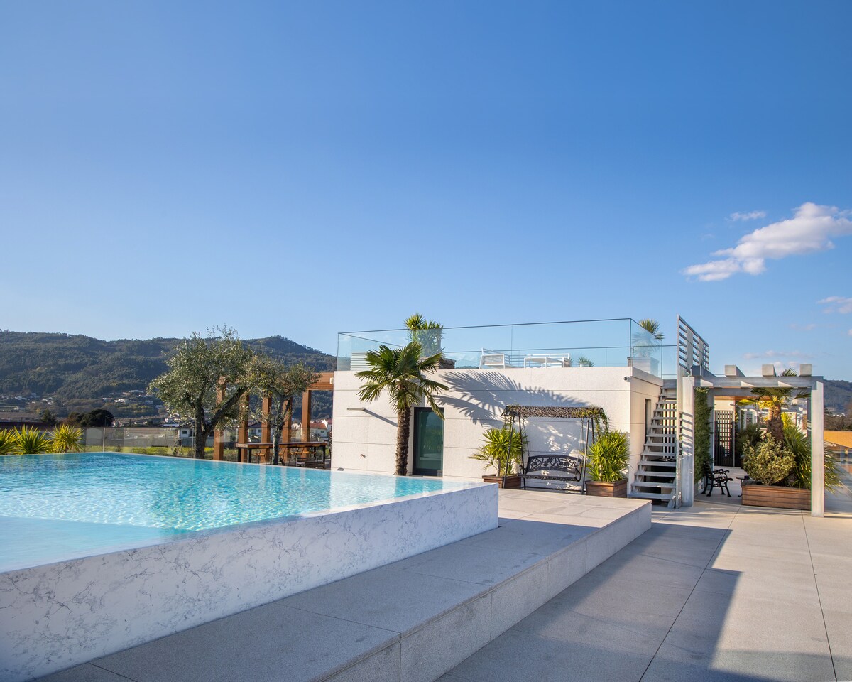 Valentina Residence by GuimaGold ofrece una piscina al aire libre en la terraza, un gimnasio, un parque infantil, tenis de mesa, futbolín, minigolf, una capilla y aparcamiento gratuito. Está ubicado en el segundo piso e incluye un balcón con vistas a la montaña, cocina equipada, aire acondicionado y baño privado. Desayuno continental o sin gluten disponible. Este apartamento en condominio privado está a 10 minutos del centro de Guimarães y Braga.