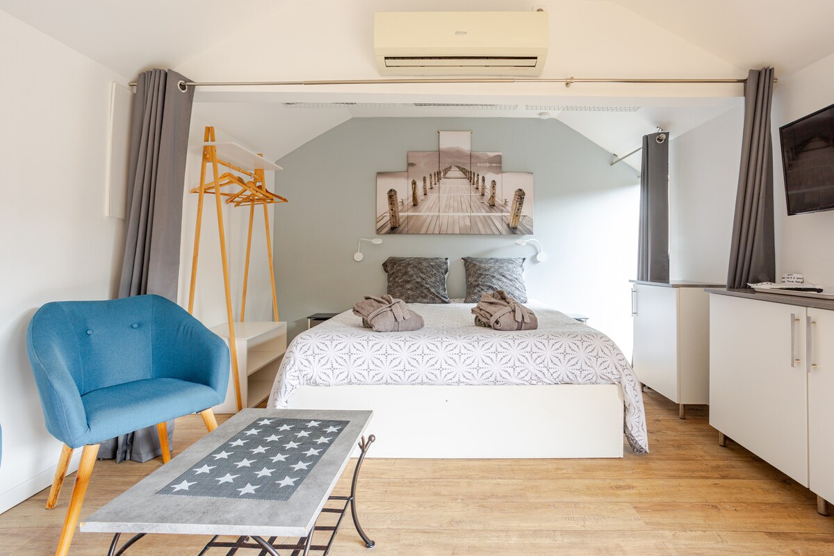 La Hume cerca del centro, alojamiento acogedor, independiente de 37 m2 con aire acondicionado situado en una propiedad privada tranquila. A dos pasos del bosque de Chêneraie, de la estación de tren a pie (unos 900 m), y muchas tiendas cercanas, (supermercado, pizzería, panadería... A 1 km encontrará Aqualand, Coccinelle, el club de tenis, la piscina el Laser Game, arborismo. El puerto y la playa de la Hume a 1 km con sus cabañas de ostras. A 10 minutos de Arcachon y a 15 minutos de las playas oceánicas