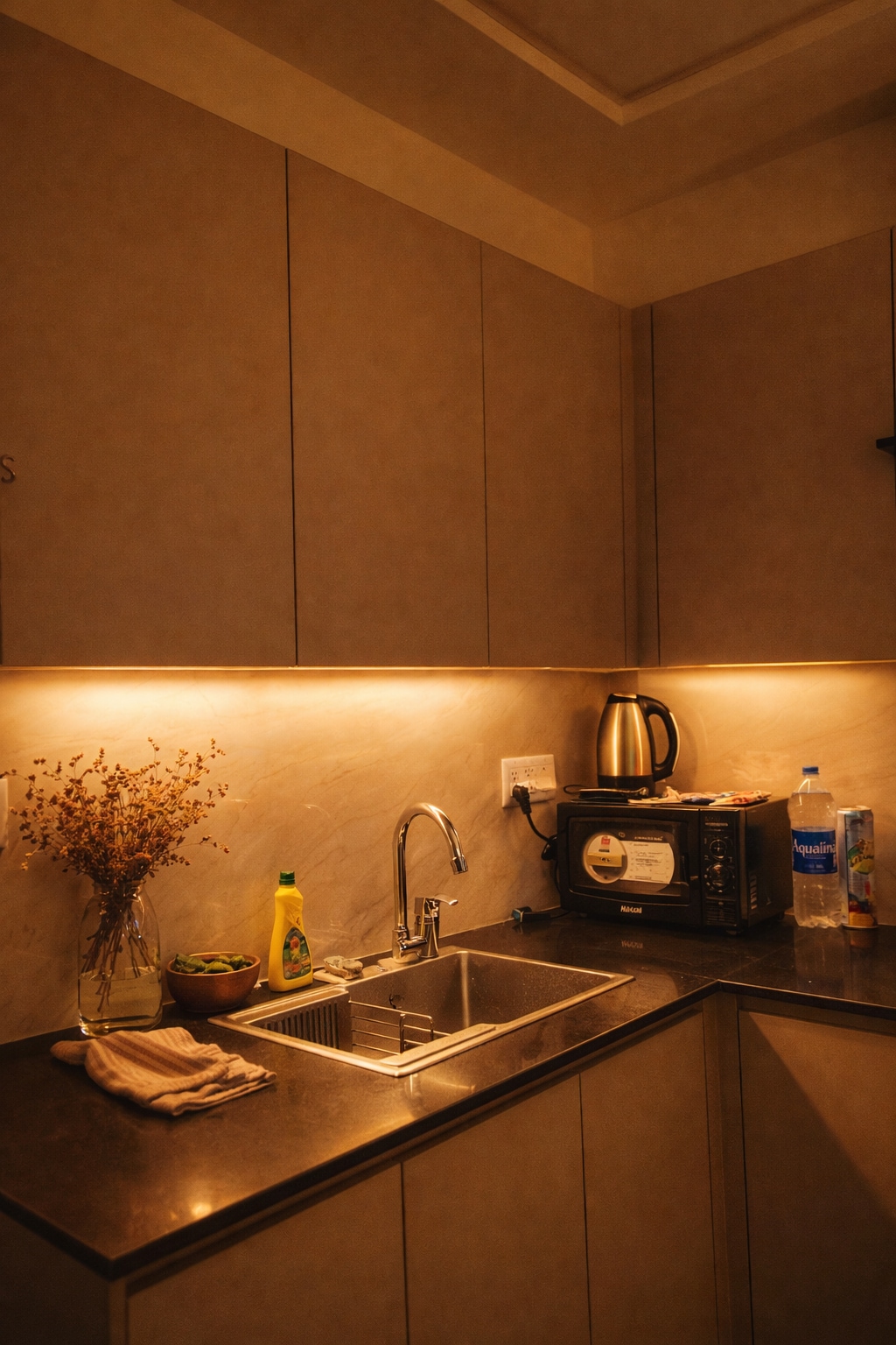 Welcome to Astro, a modern designer apartment crafted around elegance, warmth, and architectural flow. Featuring a stunning curved LED media wall with a statement moon feature, this space blends ambiance with comfort for a truly elevated stay. Relax on plush sofas and enjoy your favorite shows on the 4K Smart TV, perfectly positioned against the aesthetic backlit wall for a cinematic experience. Whether you're unwinding after a long day or hosting a cozy movie night, Astro delivers atmosphere.
