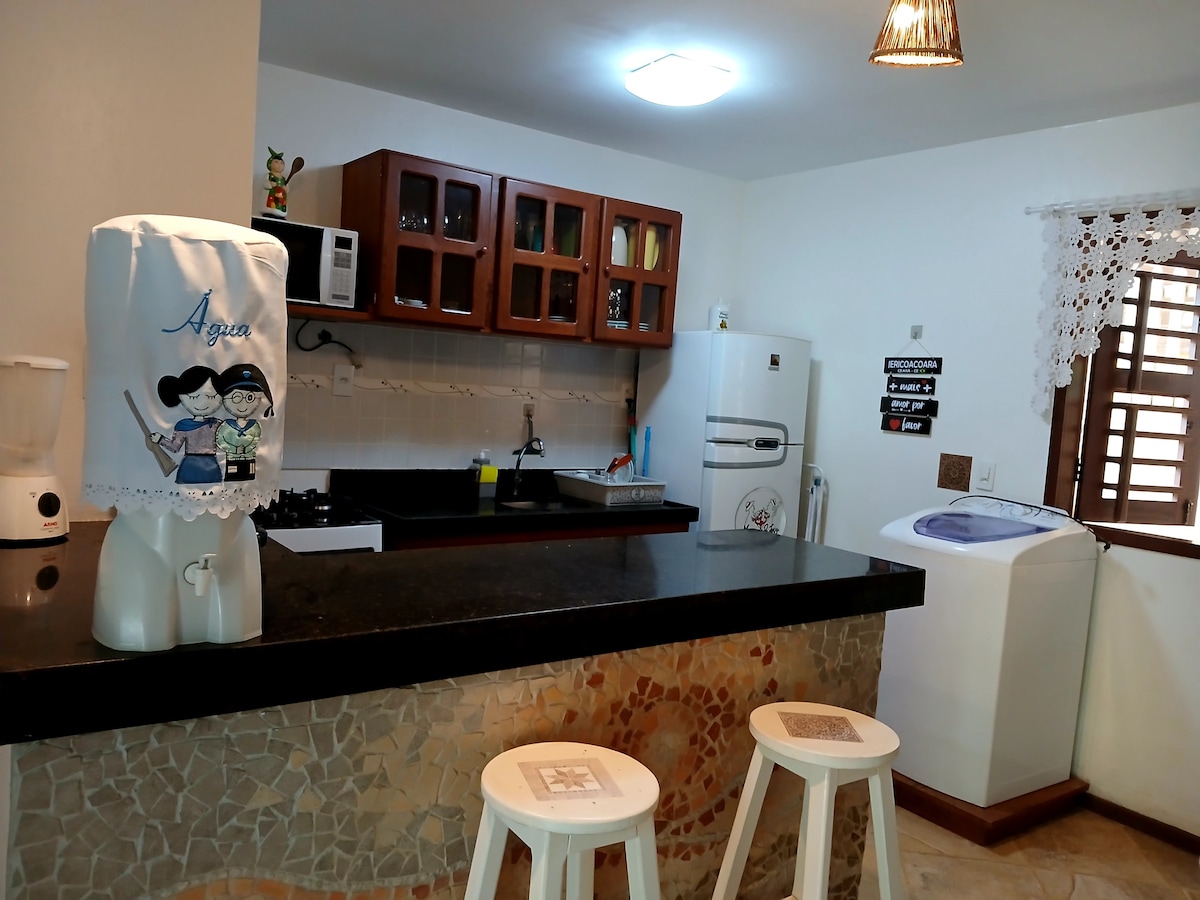 Apartamento lindo e novinho todo em madeira, com decoração aconchegante e confortável, andar superior. Com 50 metros quadrados possui 1 quarto com cama de casal, ar condicionado, TV, WI-FI, cozinha americana equipada com geladeira, fogão, utensílios de cozinha. Perfeito para casal, mas é possível acomodar também até 4 pessoas incluindo o sofá cama. Estamos localizados muito bem no centrinho de Jeri, perto da praia, restaurantes, padarias, vida noturna e muito mais.