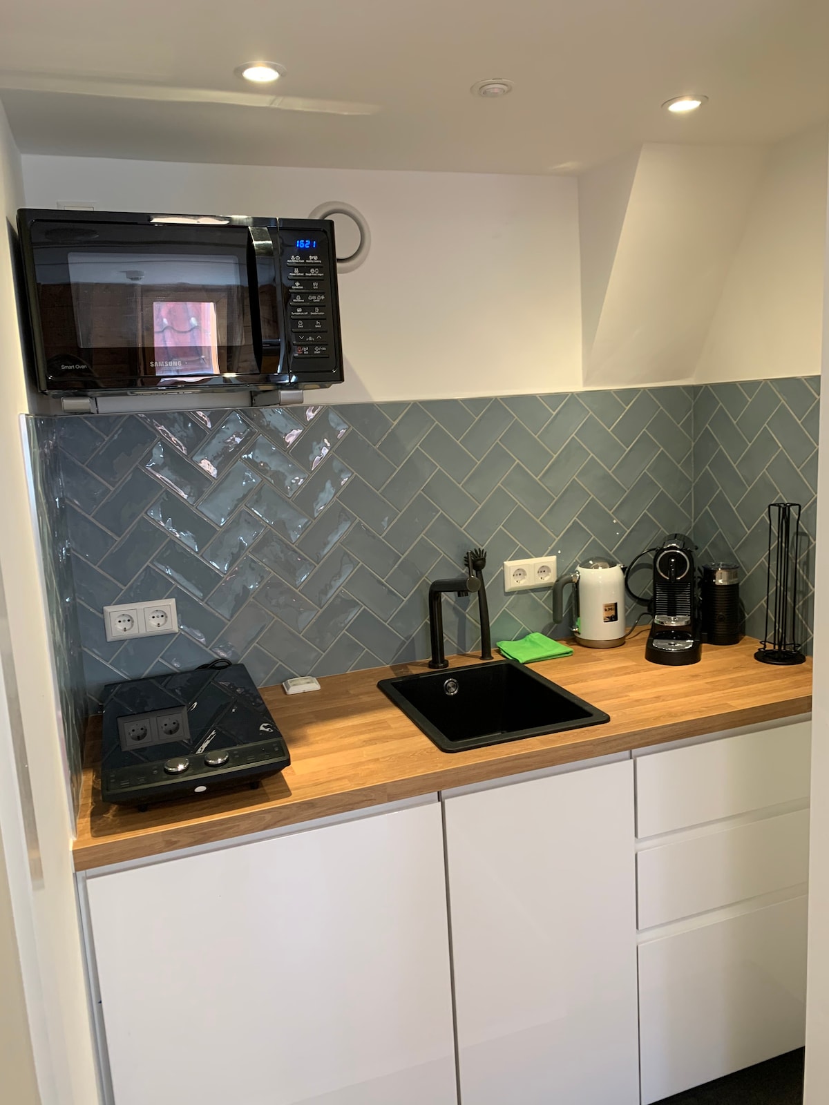 El estudio está convenientemente ubicado en la planta baja. Es un espacio privado equipado con todas las comodidades. Cama cómoda, cocina donde puedes preparar una comida sencilla, mesa y sillas, cafetera Nespresso y hervidor de agua. El cómodo baño tiene una cabina de ducha, lavabo e inodoro. Toallas de baño, champú, acondicionador, secador de pelo y plancha incluidos.