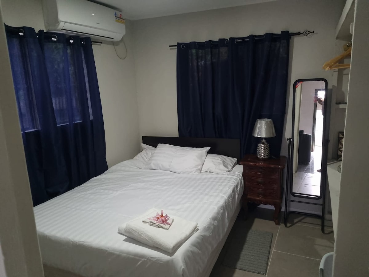 This fully furnished 2 bedroom house is perfect for a family of 4-5. Air conditioning in the lounge and main bedroom plus pedestal fans throughout. Hot and cold water in the shower with a washing machine available. You can either use rainwater (if the tank is full) or tap water. Bedroom 1 - queen bed. Bedroom 2 - double and single bed. The property is fully fenced with a large yard. Just 6mins from the CBD with a convience store across the road.
