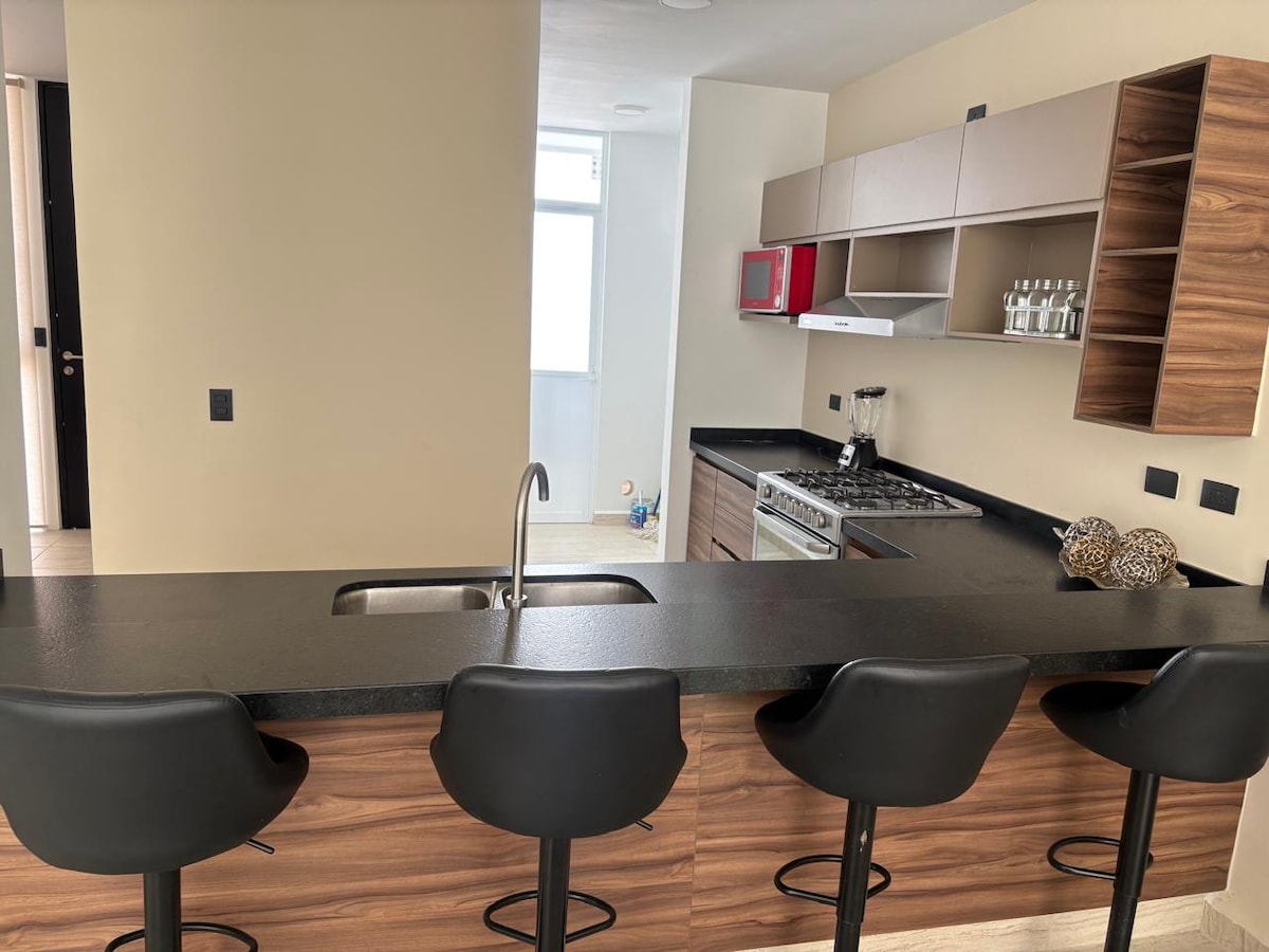 Bonito departamento con terraza en segunda planta con una cama King size, un sofá-cama y un sofá. Contamos con pantalla S-Mart TV para que puedas acceder a tus plataformas preferidas. El departamento se encuentra cerca de las avenidas principales de la ciudad, por lo que facilita el acceso al centro histórico, así como la movilidad al sur de la ciudad. Cuenta con cochera techada y portón eléctrico. Hay todo tipo de comercios a menos de 5 minutos caminando. ***Facturamos tu estancia***