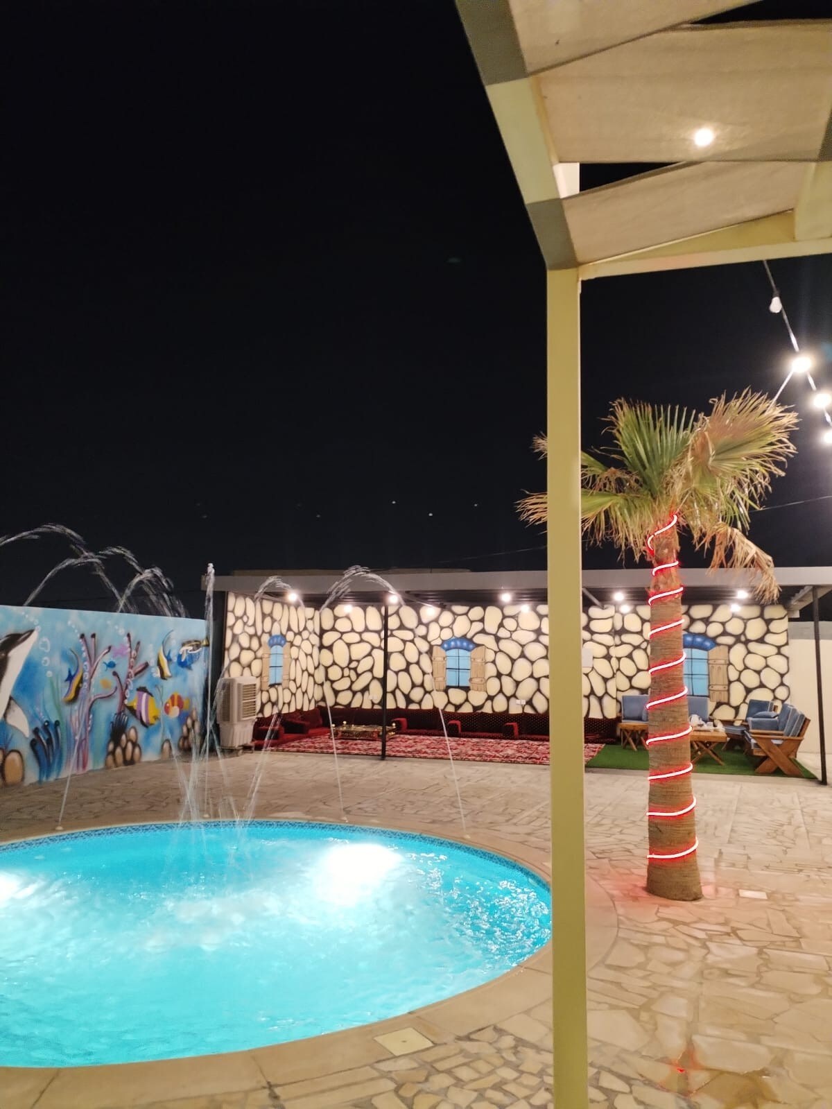 شاليه مميز يتكون من صالة ومجلس وغرفتين نوم 3 اسرة 2 مفردة وواحد مزدوج وطاولة طعام ومطبخ كامل متكامل وملحق خارجي ب اوجار نار ولعبة الهوكي ومسبح كبير وصغير للاطفال و4 دورات مياه وجلسة خارجية وكراج للسيارة وحوش