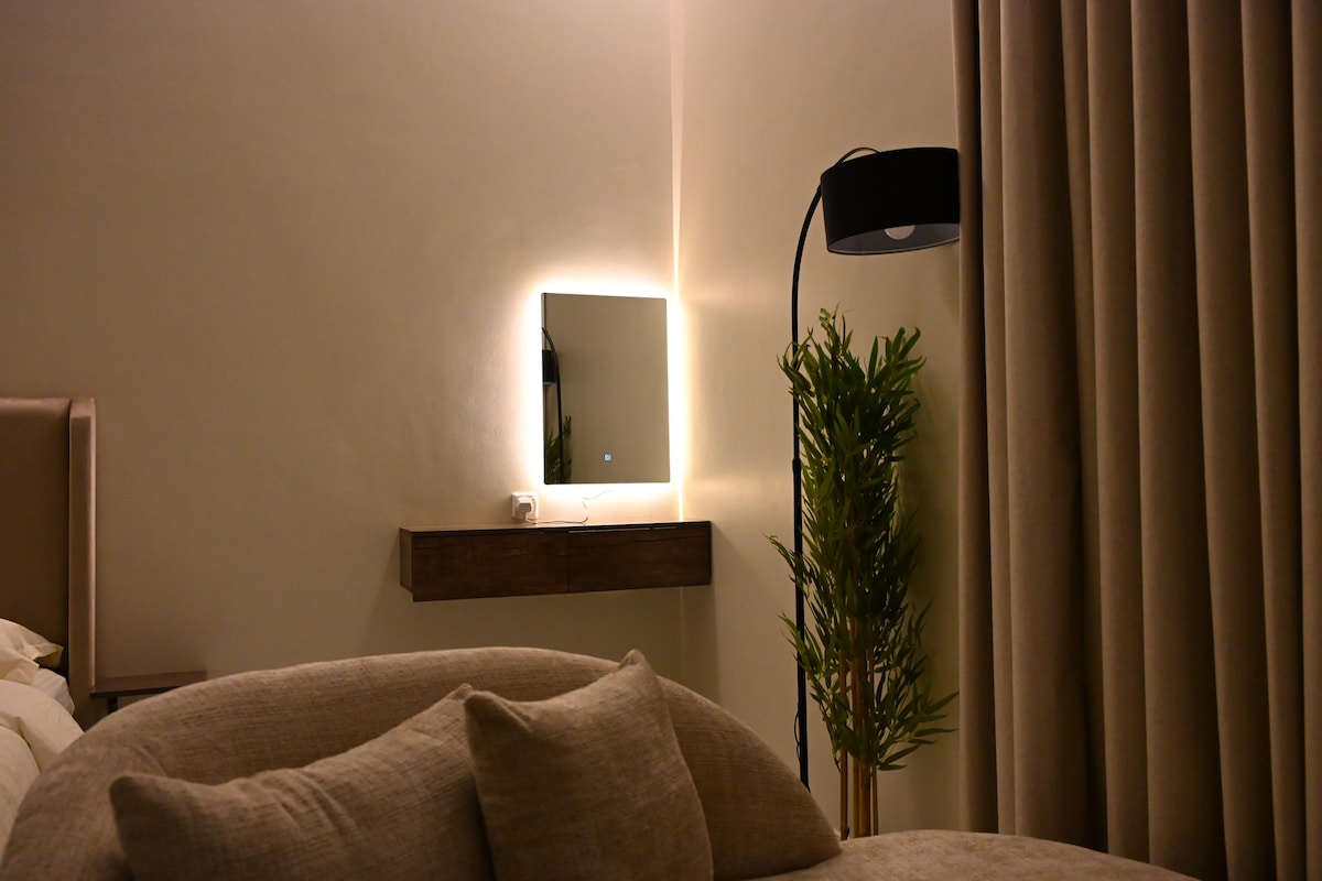 Un hermoso estudio de estilo hotelero que combina comodidad y lujo en un solo espacio con un televisor de 75 pulgadas.