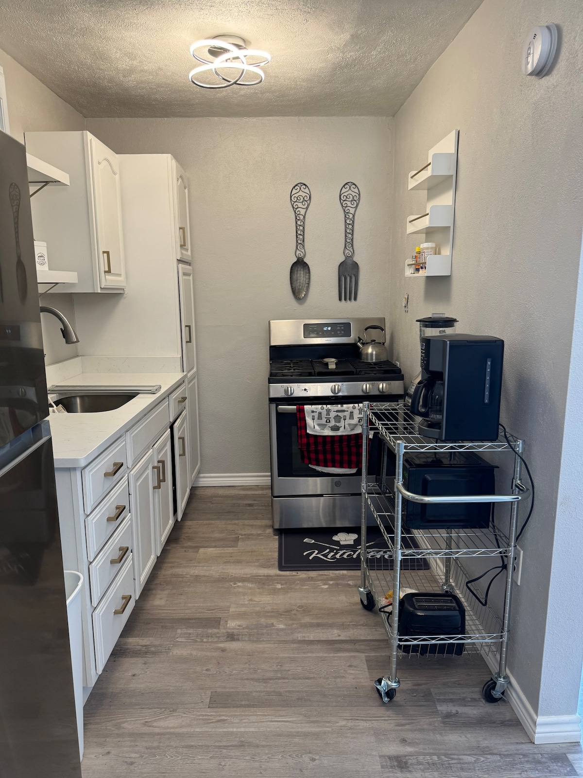 Spacious 1,000 sq ft 1-bedroom townhouse located in Plainview, directly on the I-27 corridor between Amarillo and Lubbock. Ideal for traveling professionals and those working at the Abernathy Data Campus or Wayland Baptist University. Features a two-story layout with vaulted ceilings, a fully equipped kitchen for preparing meals, a private in-unit washer and dryer, and comfortable reclining sofas. A practical, well-equipped home base for short or extended stays.
