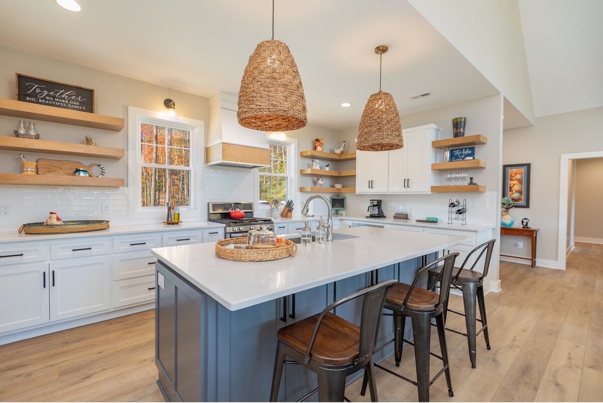 ¡Hermosa casa nueva frente al lago en una cala tranquila cerca del lago principal con todos los servicios y fabulosas vistas! ¡Amplio rancho con 5 BR, 3,5 baños, plano de piso abierto, sala de juegos, gran terraza cubierta con un porche protegido con vistas al lago! Artículos de cocina y baño totalmente surtidos. El muelle privado con TV está disponible para tu disfrute, un espacio de reunión perfecto con agua de 10 pies de profundidad para deportes acuáticos de verano (chalecos salvavidas, paddleboard, kayaks incluidos) o para ver el partido en el agua en el otoño.