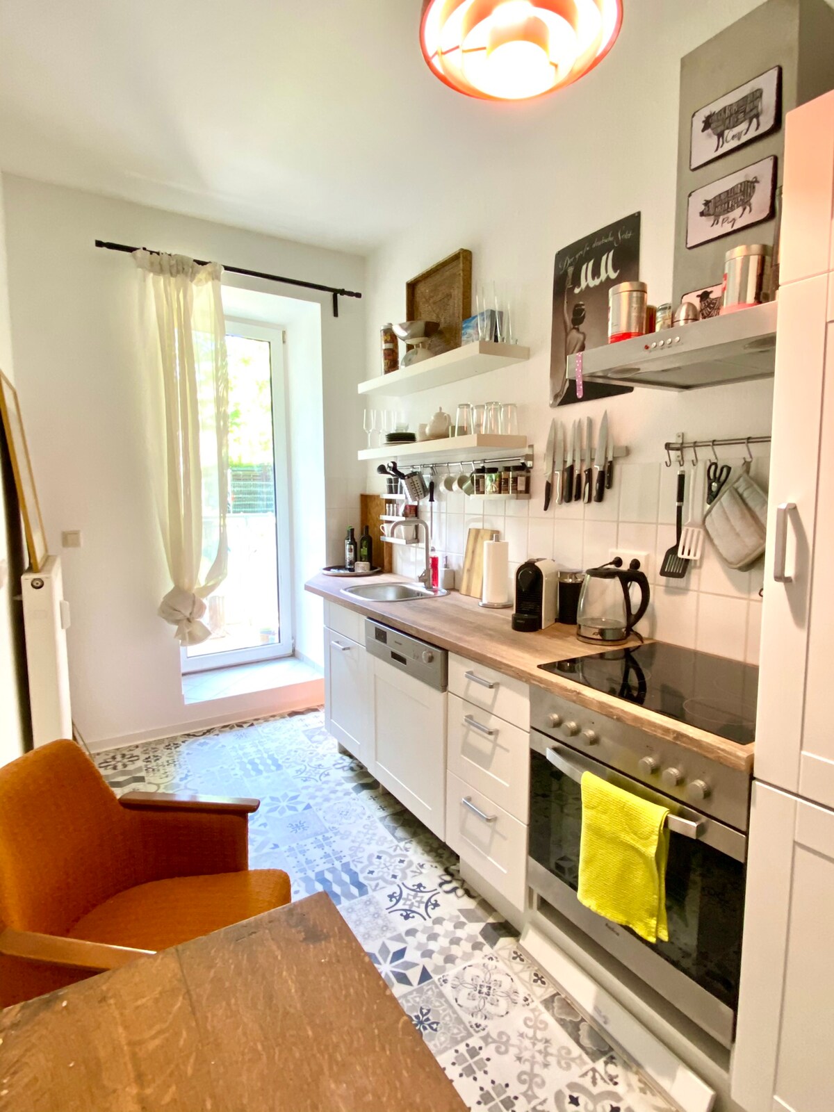 Nuestro apartamento elegantemente amueblado en un edificio histórico ofrece un espacio generoso, techos altos, una fachada magnífica, una gran escalera, suelos de parqué en espiga y estuco ornamentado. Gracias al espacio abierto de enfrente, podrás disfrutar de una hermosa vista a la vegetación y de total privacidad. Los chefs aficionados estarán encantados: la cocina está equipada con muchos utensilios.