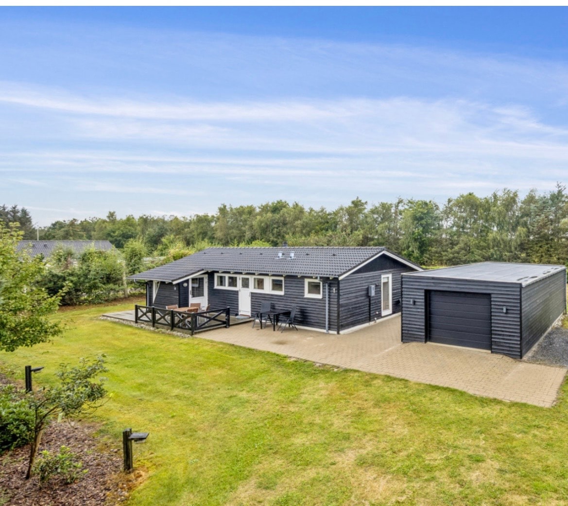 Casa de campo espaciosa y encantadora de 62 m2 con 6 camas, acogedora y gran terraza de madera con sol todo el día, baño en la naturaleza con ducha al aire libre, así como comedor cubierto al aire libre. En el interior hay un gran sofá, cocina, baño modernizado con ducha. Un hermoso jardín que invita a divertirse y jugar, y a solo 1000 metros de la playa en los días calurosos. Minigolf, parque acuático y poner y tomar el lago de pesca en Lagunen, a solo 600 metros de distancia. Parque infantil a 150 metros de la casa. La casa de verano incluye ropa de cama y toallas.