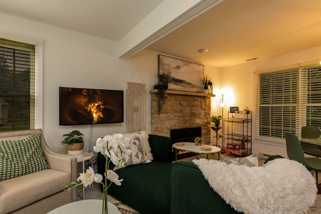 Casa del árbol única: ¡una pequeña casa octogonal rodeada de bosques! Casa de 2 dormitorios y 2 baños donde podrás disfrutar de las vistas de la naturaleza alrededor, con ventanales del suelo al techo. Una cama tamaño king, una cama tamaño queen. Comodidades modernas con divertidos toques de color negro. ¡Jacuzzi privado y chimenea con vistas a bosques serenos! Siéntate junto a la chimenea de gas interior y disfruta de nuestra colección de discos. Sumérgete en una bañera japonesa. ¡Disfruta de los colores del otoño o mira cómo cae la nieve! Piscina comunitaria interior pobre, piscina exterior de temporada, acceso al gimnasio.