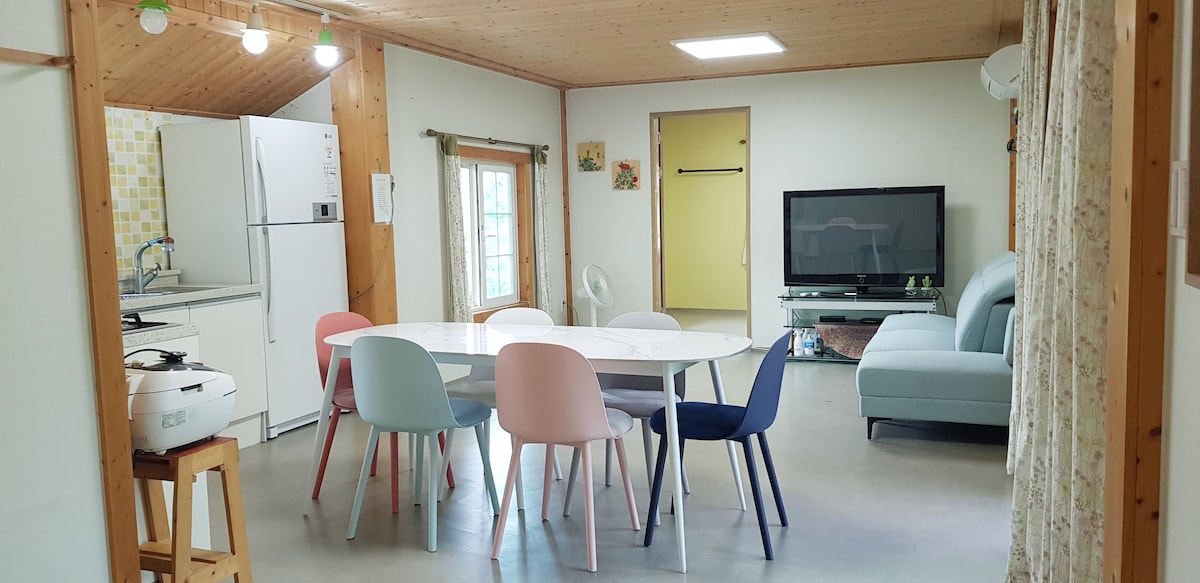 Es un anexo de una casa unifamiliar ubicada en una zona residencial unifamiliar tranquila. En el gran césped del patio hay 2 perritos pequeños y carpas en el estanque. Puede hacer una barbacoa en el césped y divertirse en el karaoke subterráneo (está equipado con aire acondicionado y calefacción). El paisaje de la mañana es muy bonito. Disfruta de la naturaleza en una mesa de jardín tranquila y pacífica con una taza de café. . . Varias flores siguen floreciendo y muriendo. El amplio campo detrás del edificio también es digno de ver, ya que el arroz cambia de verde a amarillo según la temporada ^ ^ * Check-in - 4 p. m. (el almacenamiento de equipaje está disponible desde la mañana) * Check-out - 12:00 * Barbacoa con fuego de carbón - 20 000 wones (incluso si llueve, es posible si el viento no es fuerte, y en invierno se enciende un calentador y una cortina cortavientos). * Karaoke subterráneo - Reglas de uso -Tarifa: 10,000 wones sin límite (nueva canción actualizada todos los días)/área para fumadores/bebidas alcohólicas, bebidas y alimentos no permitidos. * Ofrecemos un dispensador de agua, aire acondicionado, TV, cocina eléctrica, hervidor eléctrico, cafetera de granos, plancha, microondas, lavadora, tostadora, nevera, arrocera eléctrica, champú, acondicionador, gel de baño, toallas.