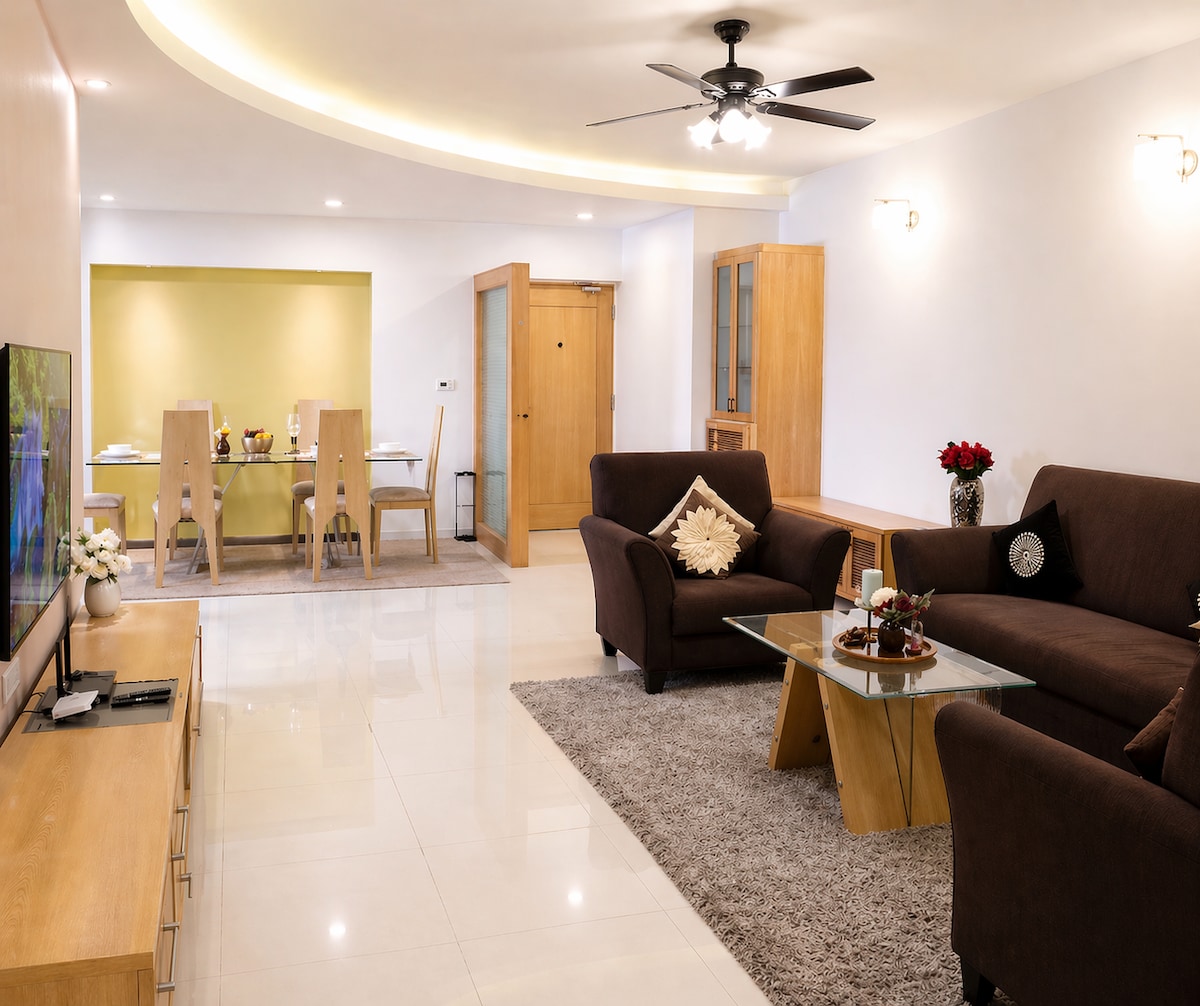Relájate en este espacio tranquilo y elegante. Un lujoso apartamento de 2 dormitorios con buen gusto hecho al aire libre que tiene un bar, comedor, mesa de póquer/billar. Perfecta para una escapada de fin de semana o incluso para una situación de trabajo desde casa. Tiene una cocina totalmente equipada, así como para estadías prolongadas. Ubicado cerca del principal centro tecnológico de Bangalore y está cerca de varias empresas de TI, restaurantes, hospitales y centros de transporte.