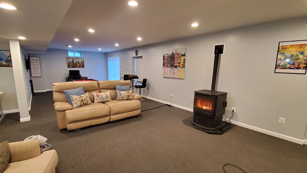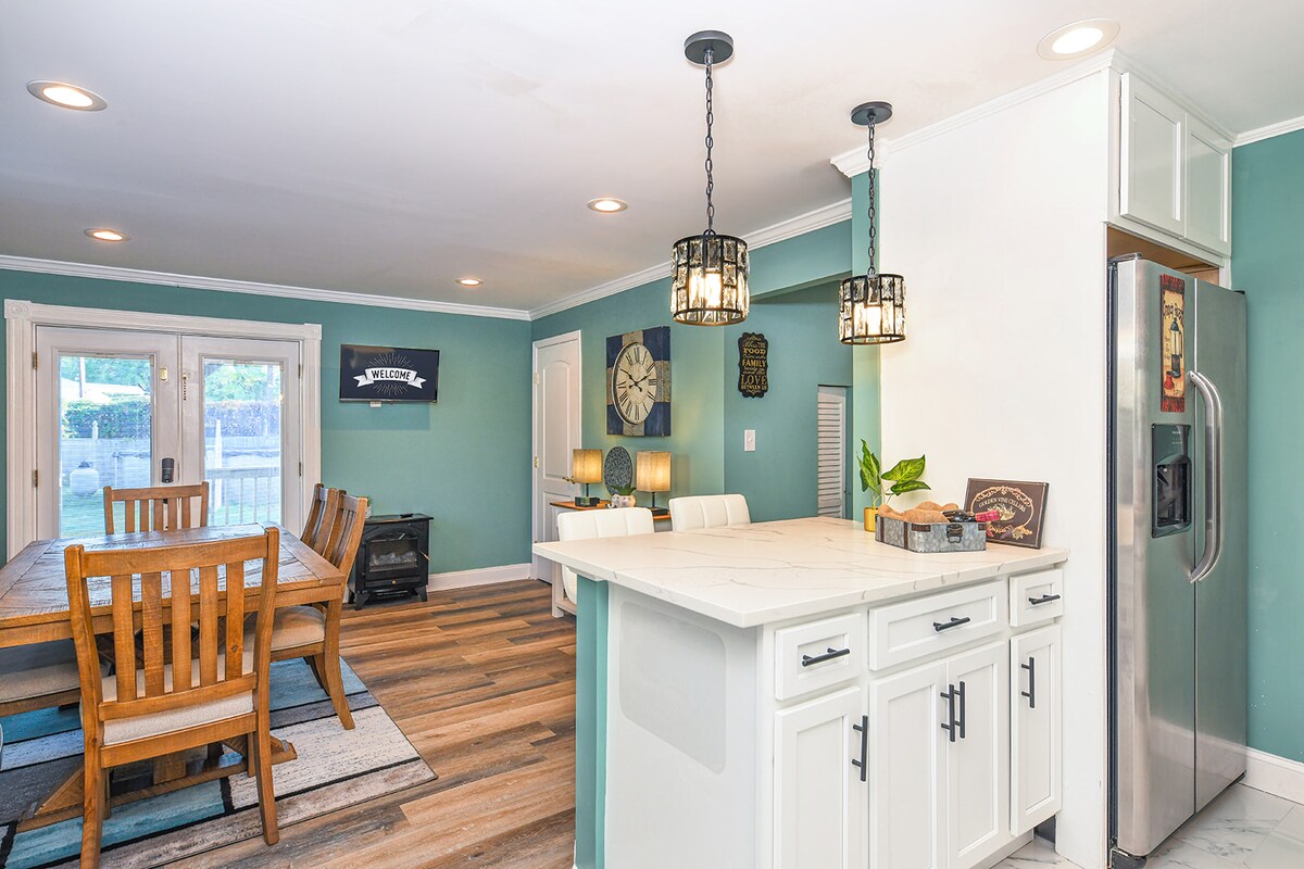 Trae a toda la familia a quedarse en nuestra espaciosa casa para dormir hasta 8 personas con 3 dormitorios (2 camas tamaño queen, uno con baño privado y 2 camas individuales), una cocina completa con cafetera y un sótano terminado con mesa de billar, bar, gimnasio y oficina con escritorio de pie. Disfruta de un patio cubierto, terraza, mesa de fuego, acceso al agua al río Gunpowder, 2 kayaks y carga de vehículos eléctricos de cortesía.
