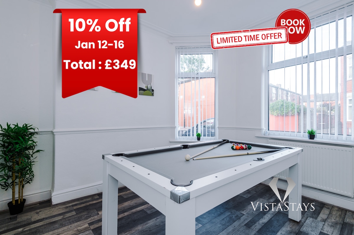 🌐 Vista Stays: alquileres vacacionales y alojamientos con servicios en Manchester🌐 🏠 Casa de 3 dormitorios recién reformada 🗝 Capacidad para 8 huéspedes 🗝 Dormitorio de 1 a 2 camas dobles 🗝 Dormitorio 2 - 1 cama doble 🗝 Dormitorio 3, 1 cama individual 🗝 Sala de estar: 2 sofás cama 🗝 Wifi gratuito 🗝 Limpieza profesional Ideal para: ➞ Contratistas ➞ Familias y amigos Reuniones de➞ negocios Estadías ➞ de días festivos Alojamiento ➞ para estancias largas ¡Añádelo a tu lista de deseos ahora!