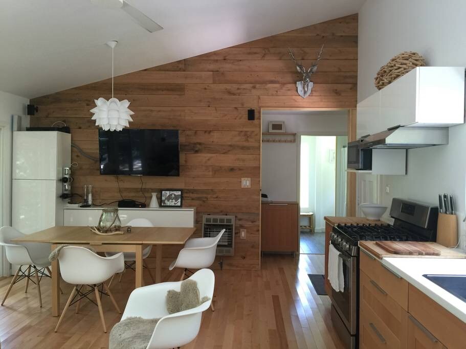 Cabaña moderna aislada. Nueva construcción con materiales ecológicos y planta abierta, luz natural. Terrazas abiertas con sensación de casa del árbol. Terraza cubierta para disfrutar de los días de lluvia. Escapada perfecta de una vida ajetreada para relajarse en un entorno natural tranquilo mientras se disfruta de hermosos muebles. TV con sistema de sonido envolvente Bluetooth y antena con canales ABC/NBC. Una colección de películas en DVD/conciertos de música. Fogata y cómodos muebles de exterior para disfrutar de fogatas, asar nubes de azúcar y observar las estrellas.