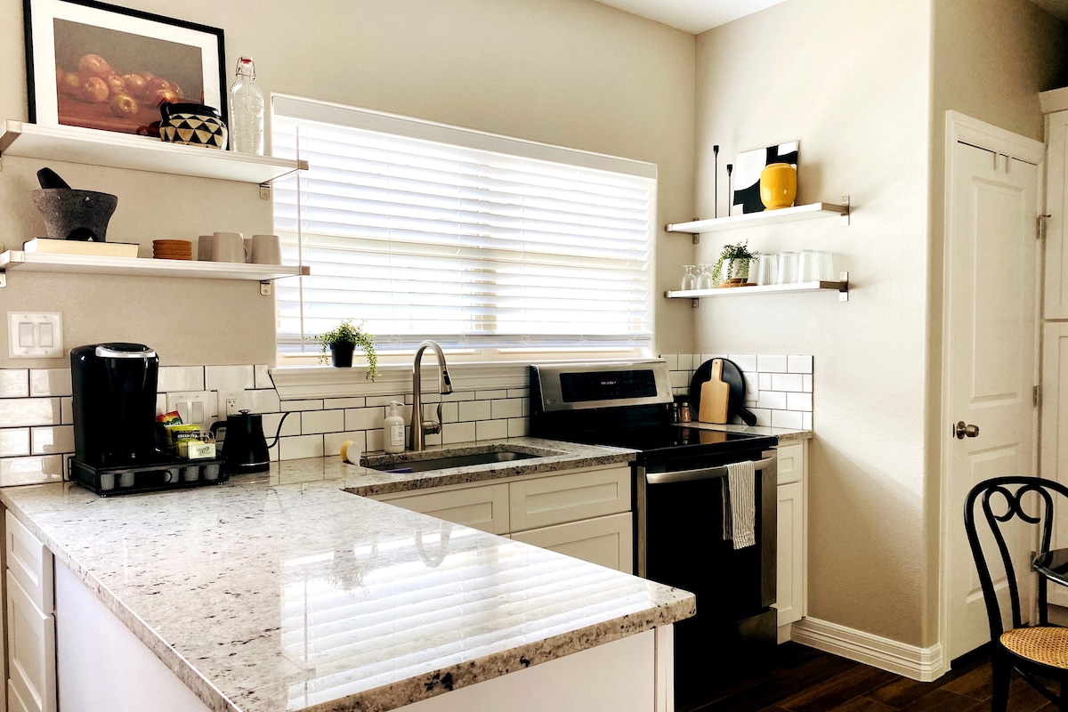 Ubicación, ubicación, ubicación: nuestra moderna casa de huéspedes está justo en medio del histórico Heights, a pocos pasos de la calle 19 y del sendero para caminatas y bicicletas Heights. Ya sea que te quedes una noche o hagas un viaje prolongado, te sentirás como en casa con una cocina totalmente equipada, cama tamaño king, TV inteligente de 65 pulgadas con cable de transmisión, wifi de alta velocidad, lavadora/secadora, estacionamiento fuera de la calle y entrada privada.