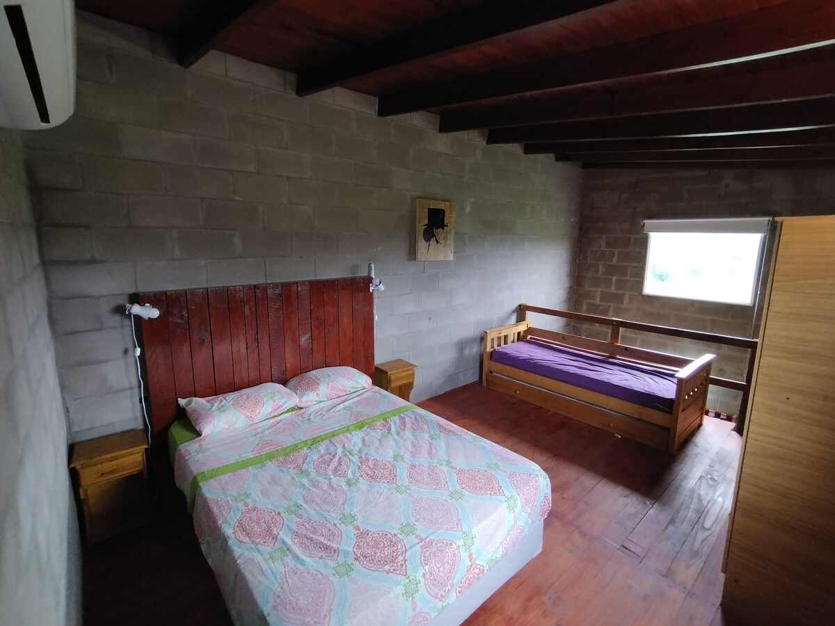 Sumérgete en la serenidad de nuestra encantadora casa de campo, 2 habitaciones (1 con aire acondicionado) y un baño interior. Piscina de fibra de 1,5m de profundidad. Ideal para familias o amigos que buscan disfrutar de la naturaleza. Kiosco en el frente y asistencia cercana, estacionamiento al aire libre. Paz y tranquilidad: no eventos ni música alta. Añadiendo encanto, tres pequeñas mascotas nos acompañan: 1 gato y 2 perros. ¡Tu refugio de fin de semana te espera!
