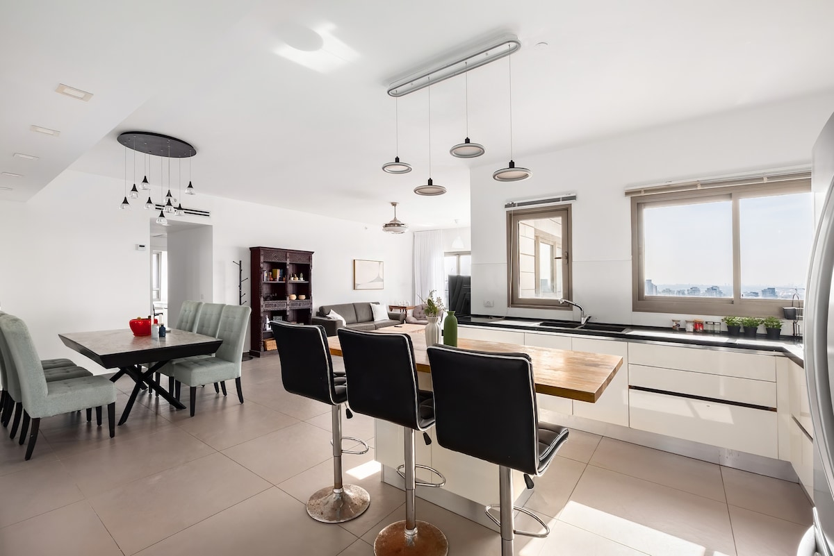 Departamento muy grande, hermoso y elegante en una residencia, muy tranquilo y limpio, muy bien decorado y mantenido, con piscina y gimnasio, ¡ofrece al huésped el aspecto de estar en un hotel y en casa ! ¡La propiedad se compone de 5 habitaciones, 4 dormitorios incluyen suite para padres! El apartamento con vistas al mar y a la playa desde el piso 17. Hasta 16 huéspedes. Restaurantes, tiendas y supermercados se encuentran en el final de la calle Edificio. El IVA debe agregarse para el ciudadano israelí, solo el papel b2 puede anular