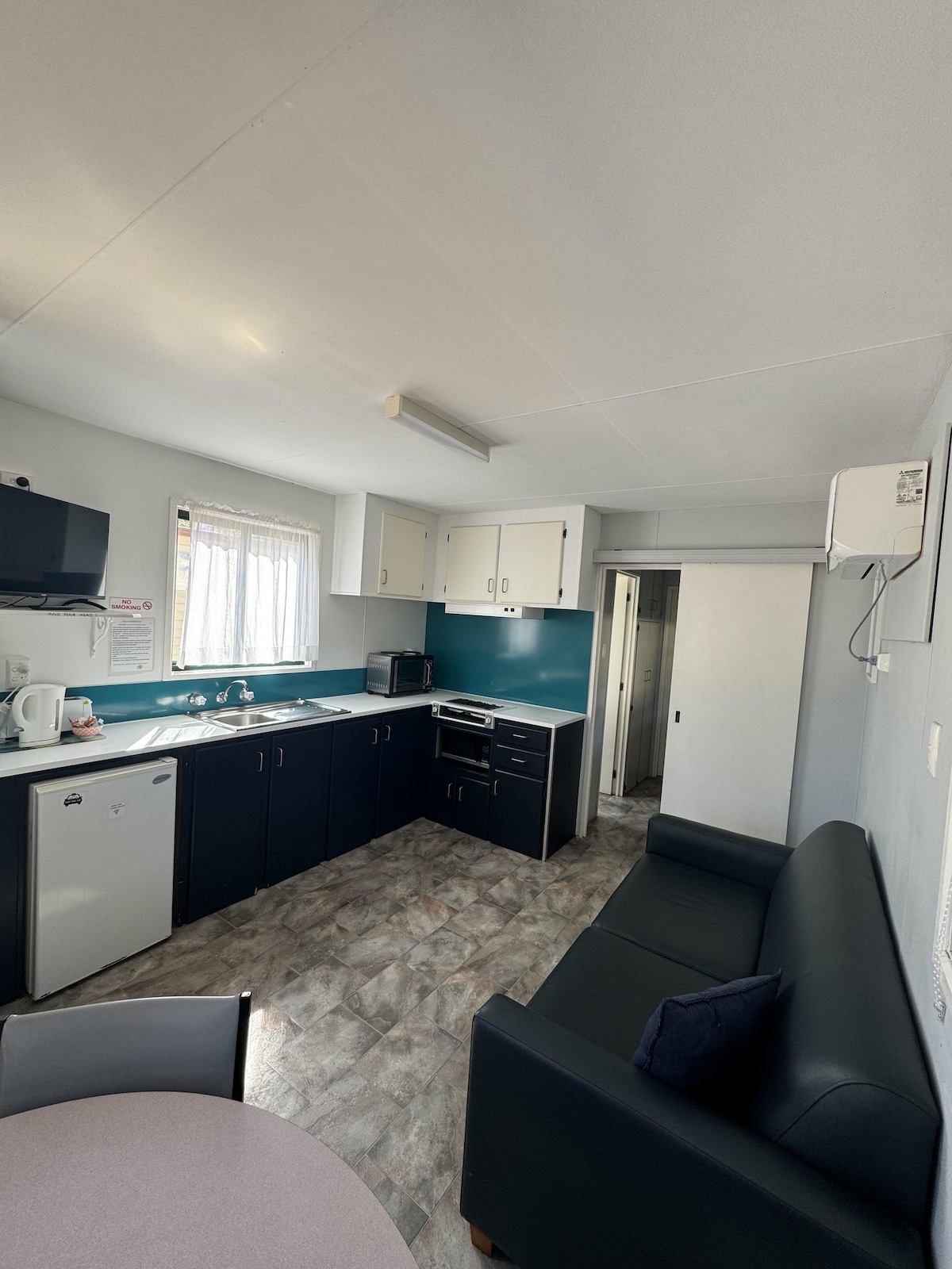 Offers comfortable accommodation for the larger family. With a small private bedroom with a double bed, this cabin sleeps up to five people and features a double ensemble sofa lounge and a tri-bunk. Featuring a fully equipped kitchen with cooktop/grill, microwave oven, cooking utensils, all cutlery and dinner set and a bar fridge, Toilet/shower. Complete with digital TV and reverse cycle air conditioning, this cabin makes for comfortable family living at an affordable price. No pets allowed.
