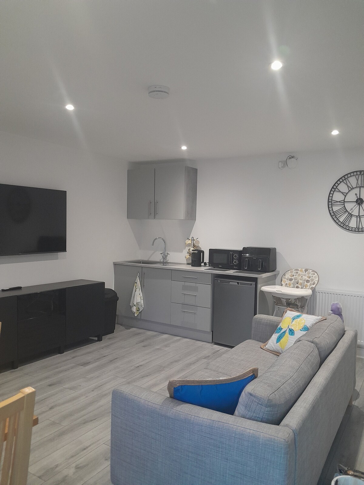 «Bedknobs» es una propiedad independiente y autónoma en nuestro jardín trasero que consta de un dormitorio doble, baño privado con ducha a ras de suelo, cocina y salón/comedor. La propiedad tiene calefacción por suelo radiante, wifi, televisión Sky con películas, reproductor de DVD, nevera/congelador, horno eléctrico, cocina de gas, cafetera y lavadora. Situado en un bonito jardín trasero con acceso a través de su propia entrada. Aparcamiento fuera de la carretera para 1 vehículo. Situado en Waterlooville, con tiendas y comida para llevar a poca distancia a pie.