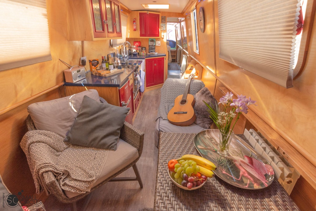 Barco estrecho recién renovado amarrado en un lugar soleado, a pocos pasos del centro de Hebden Bridge. Capacidad para 2 adultos en una cama doble tamaño queen (4 pies) nueva o en un sofá cama con sábanas de algodón suave. Cuarto de ducha Bijoux con toallas mullidas, inodoro con descarga (Porta potti) y artículos de aseo Faith in Nature. Todo lo que necesitas para pasar unos días fuera: barra de desayuno, cocina de gas con horno y mininevera. Aparcamiento de pago en el centro de la ciudad o a pocos pasos del parque desde la estación de tren.