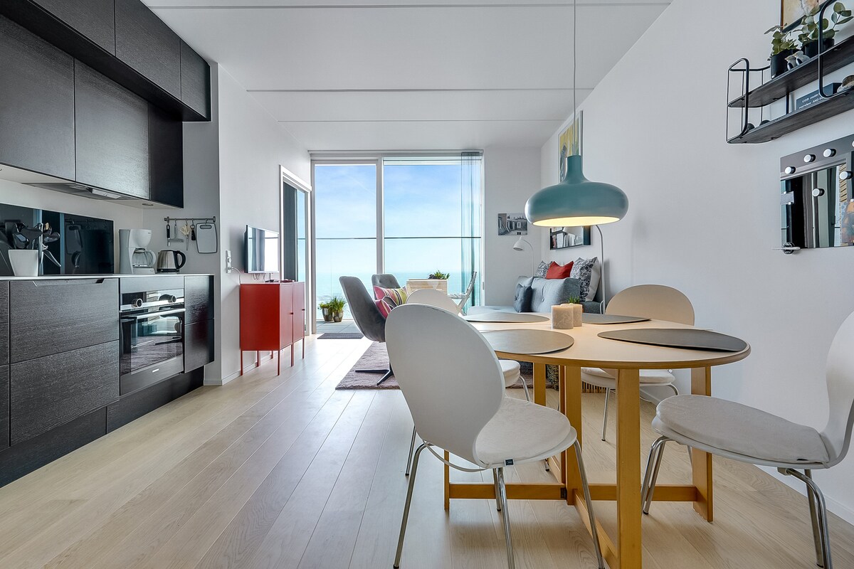 Casa con vistas panorámicas de 180 grados al mar. Moderna arquitectura con vistas al mar junto al puerto de Aarhus. Diseñada por el galardonado y mundialmente famoso arquitecto Bjarke Ingels, ofrece las mejores vistas al puerto de la ciudad y al mar. La casa de playa está situada con acceso directo al exterior y ofrece unas vistas preciosas al mar y al puerto de Aarhus. La unidad cuenta con un moderno concepto de planta abierta de dos pisos, con puertas y ventanas de vidrio del suelo al techo, lo que te permite disfrutar de increíbles vistas al mar y al amanecer.