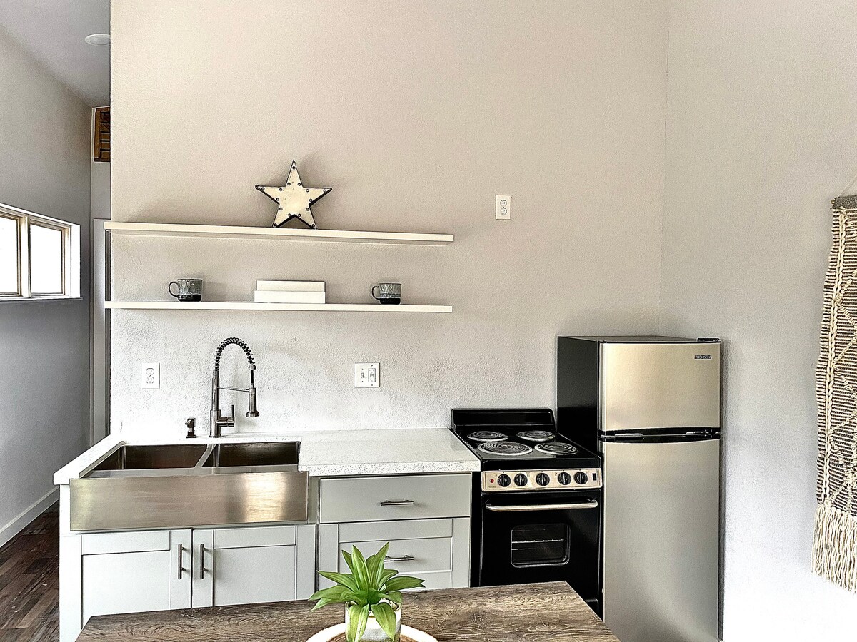 Esta cabaña es una casa pequeña que se encuentra a más de 100 pies de distancia de la casa principal con una valla de privacidad y robles en el medio. La llamamos la Casa del Prado. Esta estancia cuenta con un espacio de patio privado muy acogedor con chimenea, parrilla al aire libre y zona de patio. En el interior encontrarás un ambiente de cabaña con madera expuesta y comodidades modernas. Hay 2 dormitorios, un baño completo, sala de estar y cocina.