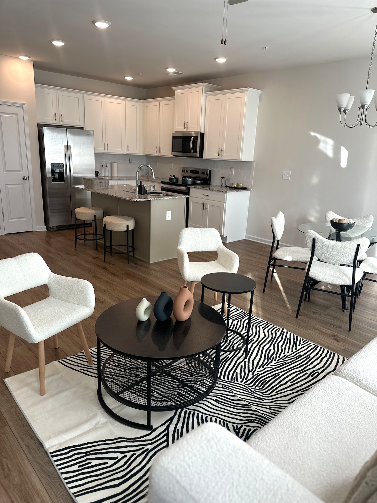 This Gorgeous 3B/2B home equipped with a full kitchen (including coffee and cooking supplies), bath (w/shampoo, conditioner, body wash), spacious in yard patio & comfortable beds+2 Rollaway beds. This clean home is located within 5 minutes to lots of restaurants & entertainment. The community comes equipped with a shared pool which only our guests/residents can enjoy during the summer. The world renowned Atlanta motor speedway is only a 10min drive! Enjoy fast free WIFI & Roku TV in every room!