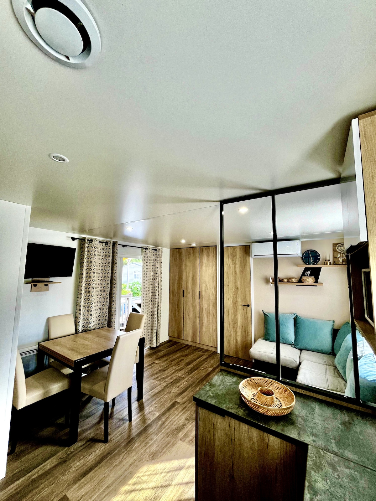 Grand mobile home neuf de 2025, avec wifi, capacité 6 personnes (une chambre parentale, deux chambres avec chacune 2 lits simples), deux salles de bain et 2 wc. Un grand canapé velours marine très confortable vous accueille, un espace repas à l'intérieur et un autre sur la terrasse couverte vous permet d'être dedans/dehors et de profiter de tout l'espace au calme. Les équipements sont de qualité, dans des tons neutres et élégants, avec en prime un superbe jardin paysagé et 2 places de parking.