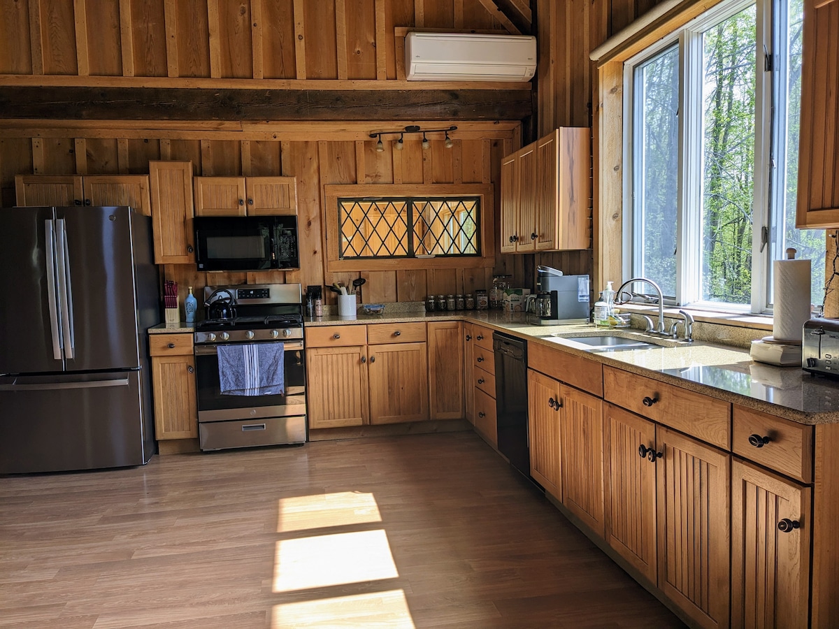 Vuelve a conectar con la naturaleza en este retiro inolvidable. Escápate a nuestro granero renovado en un paraíso ecológico de 44 acres. Disfruta de la vida moderna en una granja con techos de 25 pies, una gran habitación con hermosas vistas, cocina totalmente equipada, cama tamaño king en el dormitorio loft gigante y acogedoras estufas de gas. Camina, practica kayak o pesca en el lago de 100 acres, busca bayas silvestres y rampas en temporada o ve a esquiar a Elk Mountain justo al final del camino. Una serenidad única y un lujo rústico y natural en la naturaleza de Pensilvania.