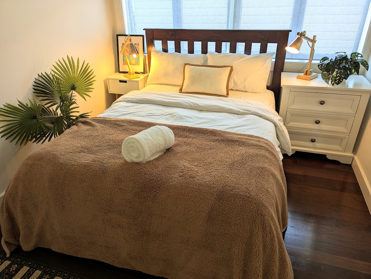 Alójate en el corazón de Bowen Hills, a unos pasos de los restaurantes de King Street, Strike Bowling y a 1 minuto a pie de Brisbane Showgrounds. Este elegante apartamento iluminado por el sol tiene capacidad para 4 personas con cama tamaño queen y un lujoso sofá cama en la sala de estar (ver fotos). Totalmente equipado con cocina, lavandería, wifi, TV inteligente y aire acondicionado. A solo 10 minutos a pie de RBWH, la estación de Bowen Hills y Fortitude Valley. Perfecto para parejas, familias o viajes de trabajo, tu acogedora base para explorar Brisbane. Diseñado para 2 personas, pero con capacidad para 4.
