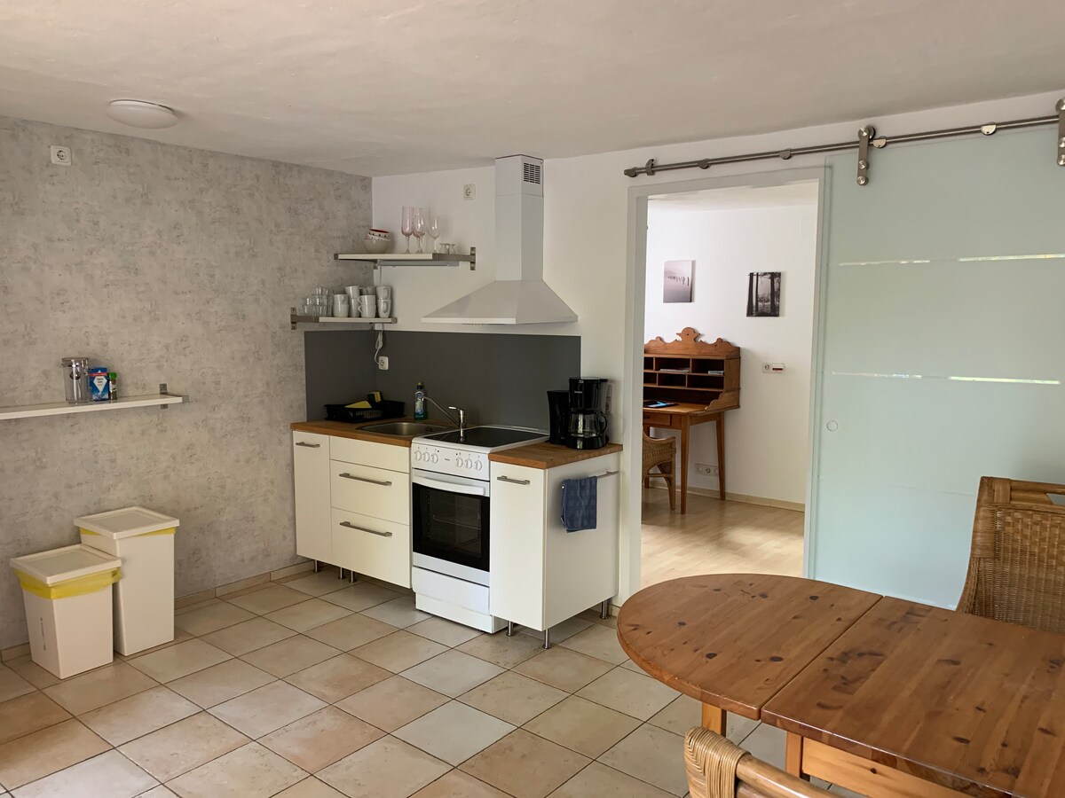 En la zona cerrada de nuestra casa. Ambiente agradable gracias al yeso de arcilla+madera; entorno precioso, muy tranquilo. y cerca: Ratzeburg (coche 5 min), Lübeck (coche 20 min). Un baño; solo UNA placa de inducción rápida, cocina sencilla, nevera, wifi. Cama doble (160x200). Además, mesa y sillas en el jardín. Bicicletas gratuitas. Autobús en B207 desvío Buchholz. Muy rápido en el lago, navegación. No se admiten animales ni se puede fumar. Telefonía limitada en la casa por el yeso de arcilla dependiendo del proveedor.