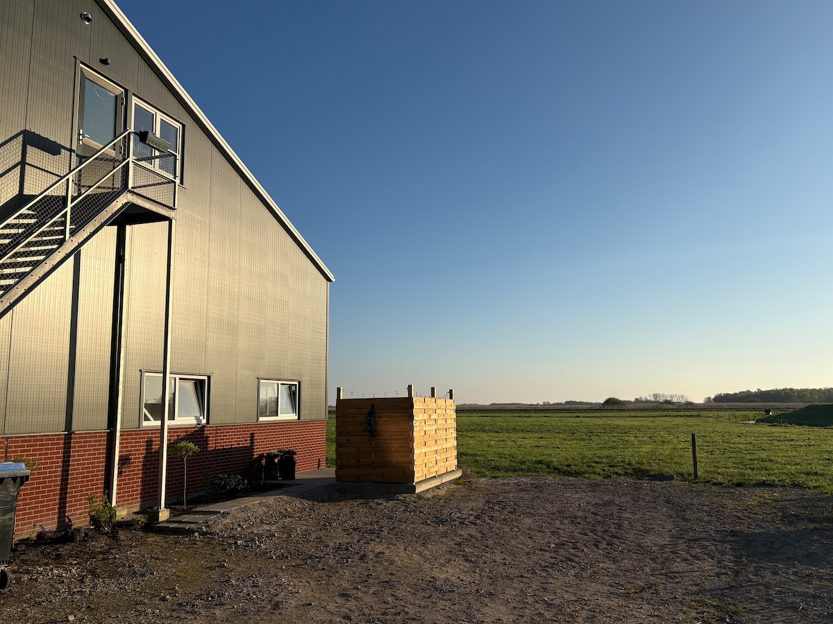 Departamento de lujo para 2 huéspedes. Baño privado, entrada, dormitorio y sala. Hay una pequeña cocina donde se puede calentar algo y hay un refrigerador. ¡En la terraza privada de verano! Amplias vistas sobre los campos y cuando comienza la temporada de cría hay un mundo de aves para ver. ¡No escuchas nada aquí, excepto el susurro del viento !