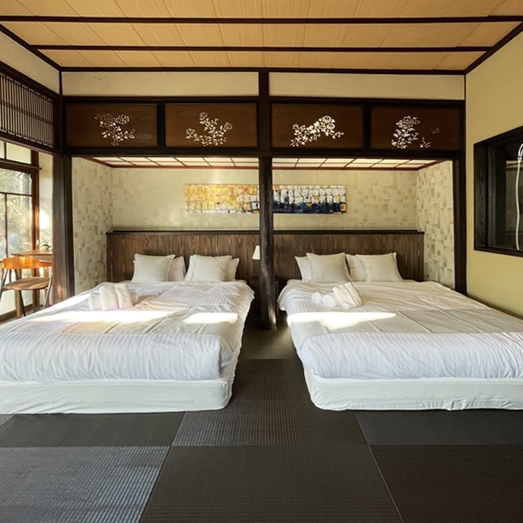 «Guest House Shin» se encuentra a una calle de Machiya-dori de Miyajima. Al pasar por la cortina de entrada, te recibe una elegante pared de bambú que recuerda a un tenya de Kioto, y un camino de piedra te conduce al patio.El patio también tiene un buen equilibrio de mármol blanco y musgo, lo que contribuye a la atmósfera tranquila.Las puertas de cristal están dispuestas de manera que el patio se pueda ver desde el salón. El edificio es accesible solo a los huéspedes a través del jardín, por lo que no hay necesidad de preocuparse por nadie.Desde el exterior, parece una casa privada normal, pero una vez que entras, el ambiente cambia, y eso es lo que hace que la posada sea tan encantadora.Me enteré de que el anterior propietario era un apasionado de la jardinería desde hacía mucho tiempo y tenía una amplia gama de aficiones.Sin embargo, como mencioné al principio, no tenía la intención de abrir una posada, por lo que no hay instalaciones de baño (hay una ducha).Sin embargo, puedes usar la posada cercana como baño al aire libre.La primera planta es un salón y la segunda planta tiene dos habitaciones contiguas de estilo japonés que sirven como dormitorios, por lo que hasta 6 personas pueden alojarse cómodamente. En el patio, hay una palabra escrita en piedras blancas rodeadas de musgo.Fue creado por un jardinero con un espíritu juguetón en el pasado, y es el origen del nombre de la posada.Quieren recibir a los huéspedes con los brazos abiertos y esperan que se relajen en su alojamiento.