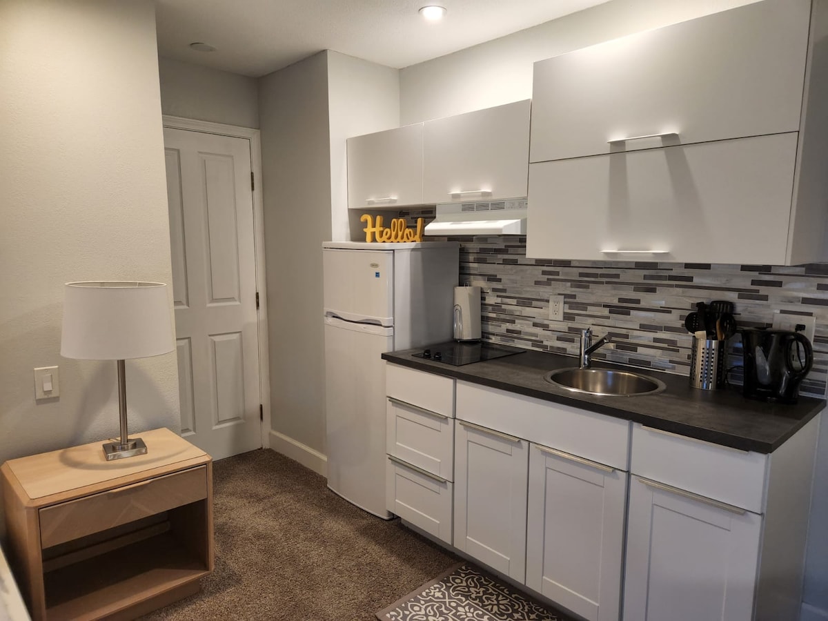 Come and leave your worries at the door in this deliciously cozy little cottage. It has everything you’ll need for a short or long stay. This unique space is a suite that has been converted from a garage…but you’d never know once you’re inside! Brand new house smell anyone? You will have a very private entrance on the side of the house with parking that you can pull right up to the door. No hauling luggage or groceries a long way here! Fast WiFi and close to Denver! Book this cozy retreat today!