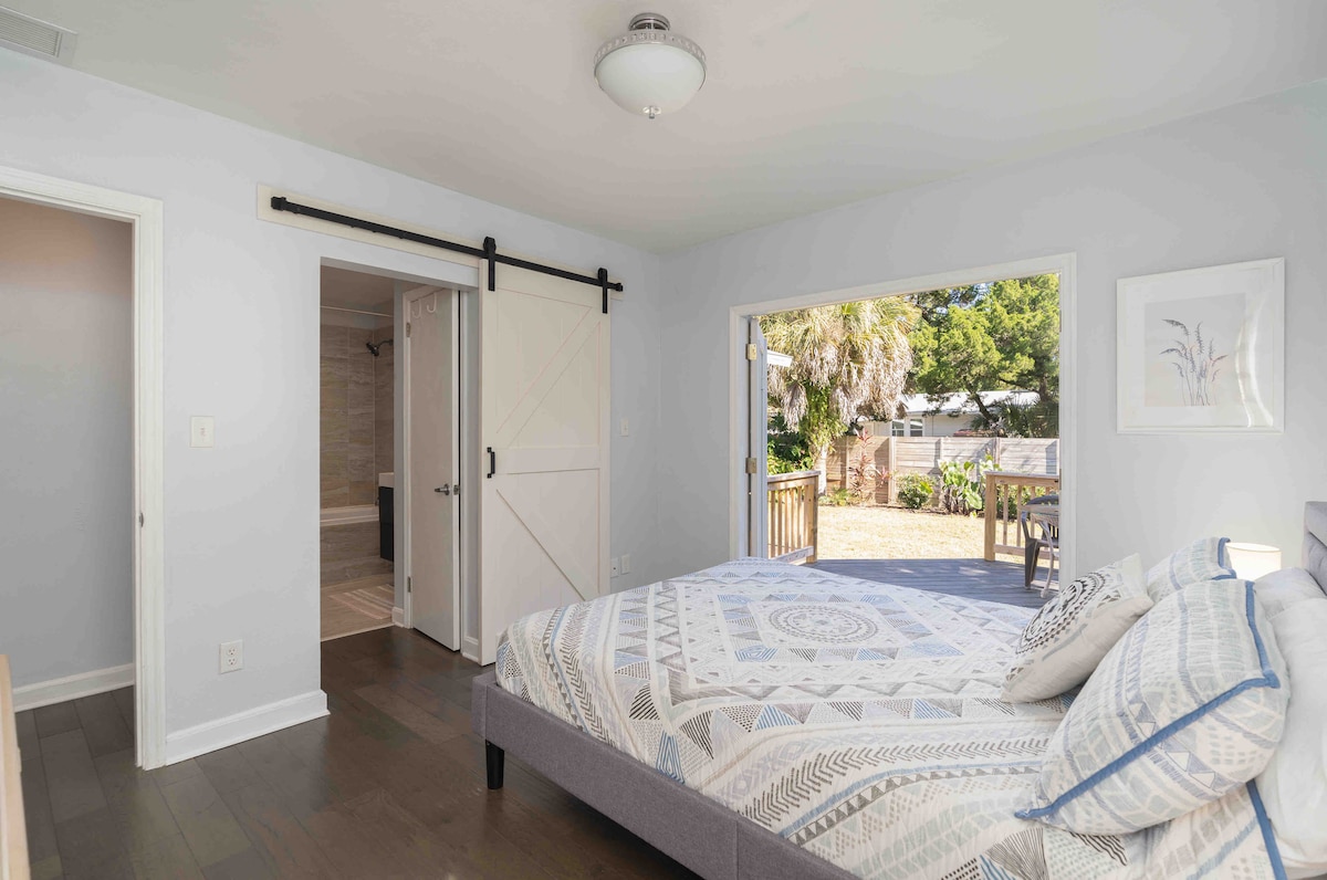 Beach & Ocean lovers retreat- Steps to ocean, close to historic area, walk to grocery/waterfront dining/roof top cocktails Gem w/lots of outdoor living. Bright, spacious cottage-style apartment w/kitchenette (No oven/stove). Fenced/gated large property. Easy 1 min walk to quiet beach! Convenient walkable beach neighborhood. Short Uber ride to historic district. Perfect for couple (baby up to 2yrs welcome) solo traveler, Flagler College parents.