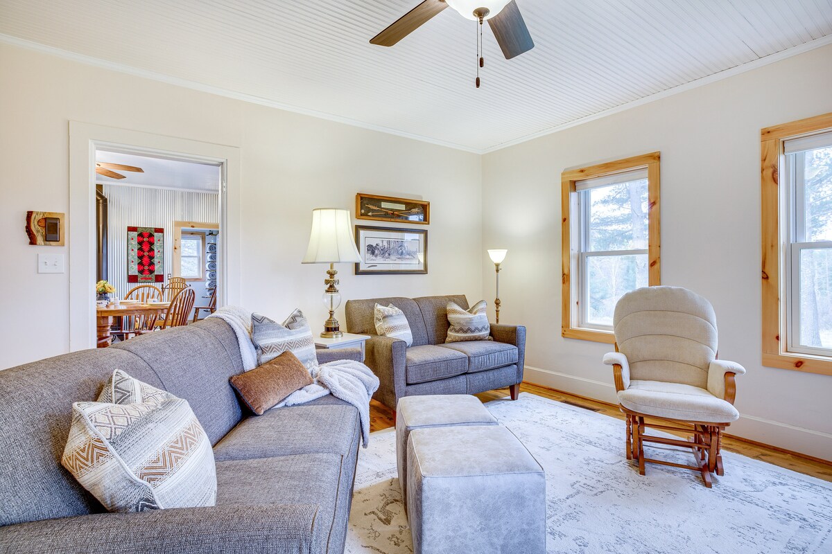 Escapa del ajetreado día a día y ven a relajarte en esta aislada y elegante granja ubicada en una tranquila carretera privada y 30 acres. Pasa tiempo haciendo senderismo, con raquetas de nieve o relajándote junto a la hoguera. Trae las motos de nieve o UTV/ATV y salta a los senderos. La casa ofrece 3 dormitorios, 2 baños, lavandería, cocina personalizada y un garaje adjunto para 2 coches. Se admiten mascotas y ofrecemos internet de alta velocidad.