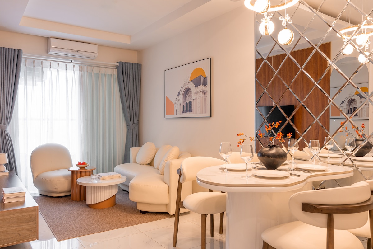 El apartamento está bellamente diseñado en estilo Wabi Sabi, situado en la planta alta del edificio ZENITY CAPITALAND en el corazón del Distrito 1. Con un estilo artístico único, el apartamento ofrece instalaciones de resort de alta clase que incluyen piscina, piscina de hidromasaje, gimnasio, sala de reuniones, sala de trabajo privada, área de barbacoa en el jardín, área de juegos para niños, amplio salón con aire acondicionado y wifi en el vestíbulo. Todas las ventanas de los dormitorios y el balcón tienen una vista panorámica de toda la ciudad. Es un apartamento único, lujoso y elegante.